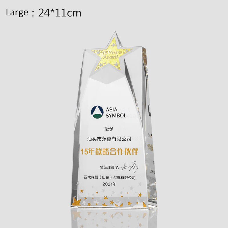 Our Custom Crystal Star Trophies are crafted with a vision of capturing the allure of the stars. The crystal used is of the highest quality, boasting a clarity that mimics the transparency of the night sky. The star – shaped body of the trophy is meticulously cut and polished, with each point of the star angled to refract light in a way that creates a dazzling display. The base of the trophy can be designed in various styles, from a simple, elegant pedestal that elevates the star, to a more elaborate base with engraved patterns inspired by constellations.