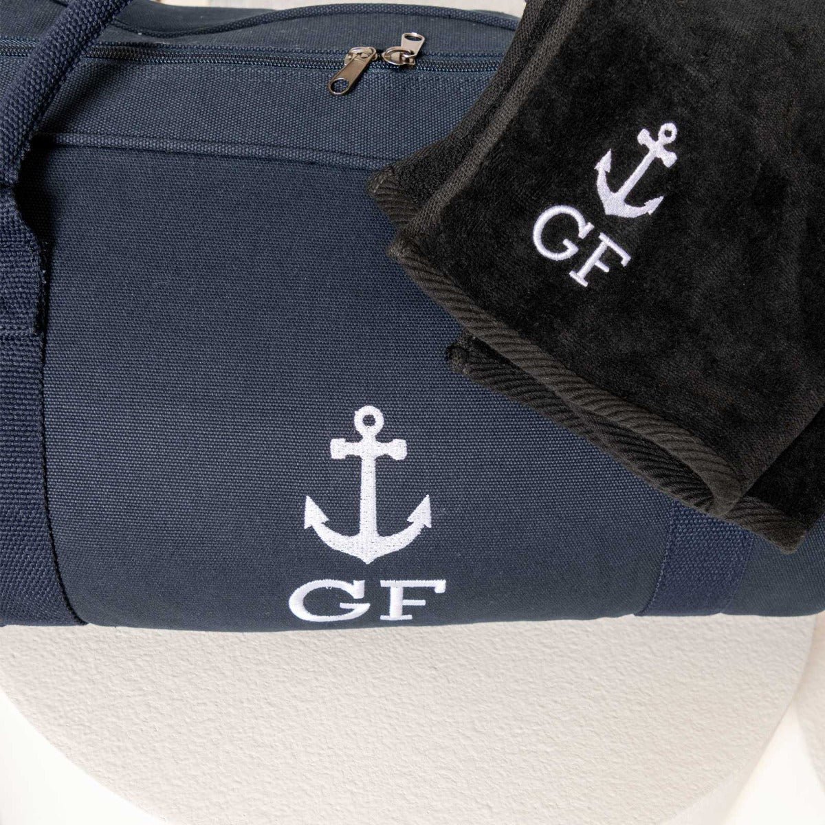 Available in midnight black or seafaring navy. the bag can be personalised by our team with the embroidery of up to three initials in a choice of great colours. sitting below the stylish anchor.