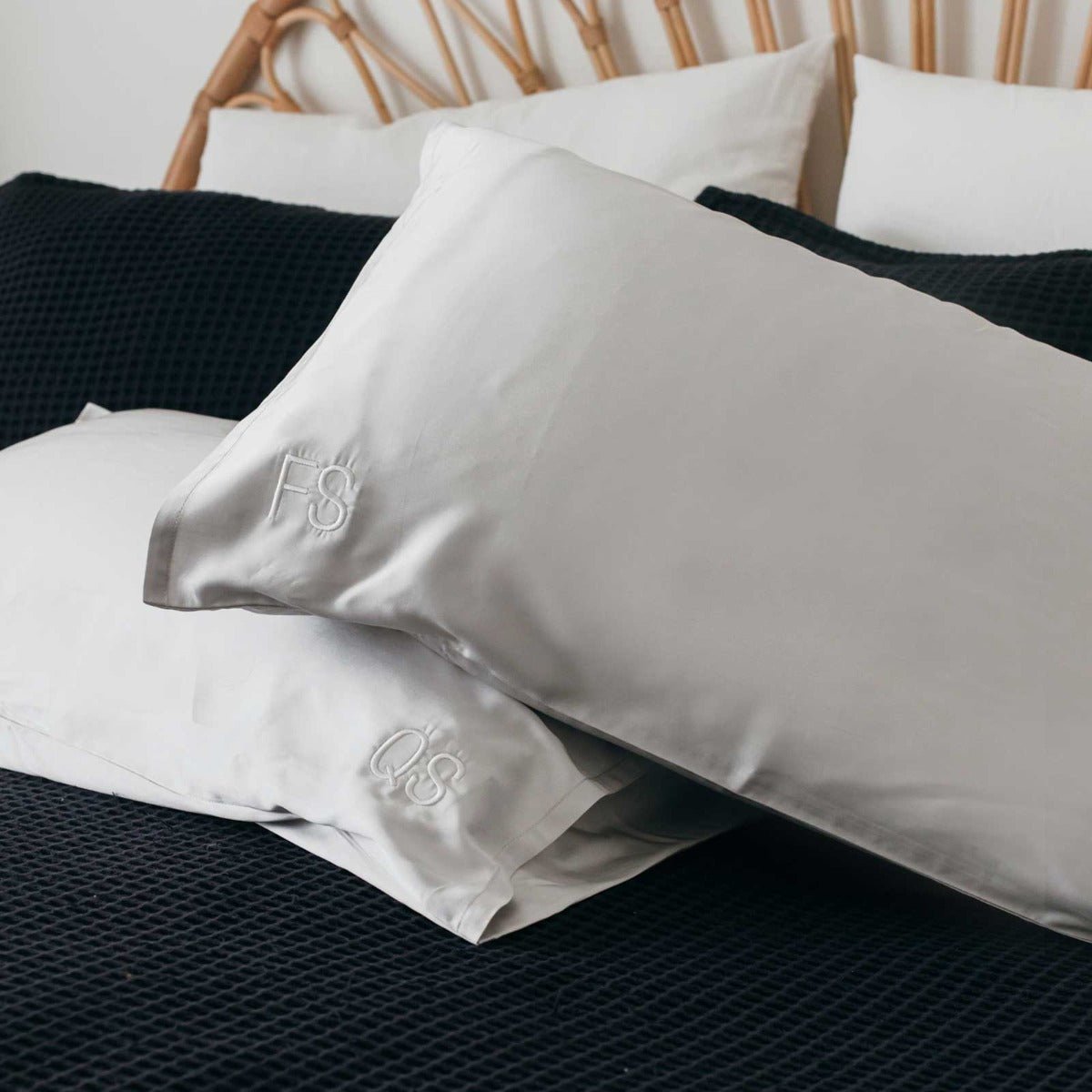 Transform any bedroom into a stylish slumber sanctuary with the gift of these stunning silver bamboo satin pillowcases. The gorgeously gender-neutral shade of silver grey means this set will suit any couple. and once our team of experts embroider your initials. these pillowcases will be a personalised sleeptime keepsake to be cherished and snoozed on for years.