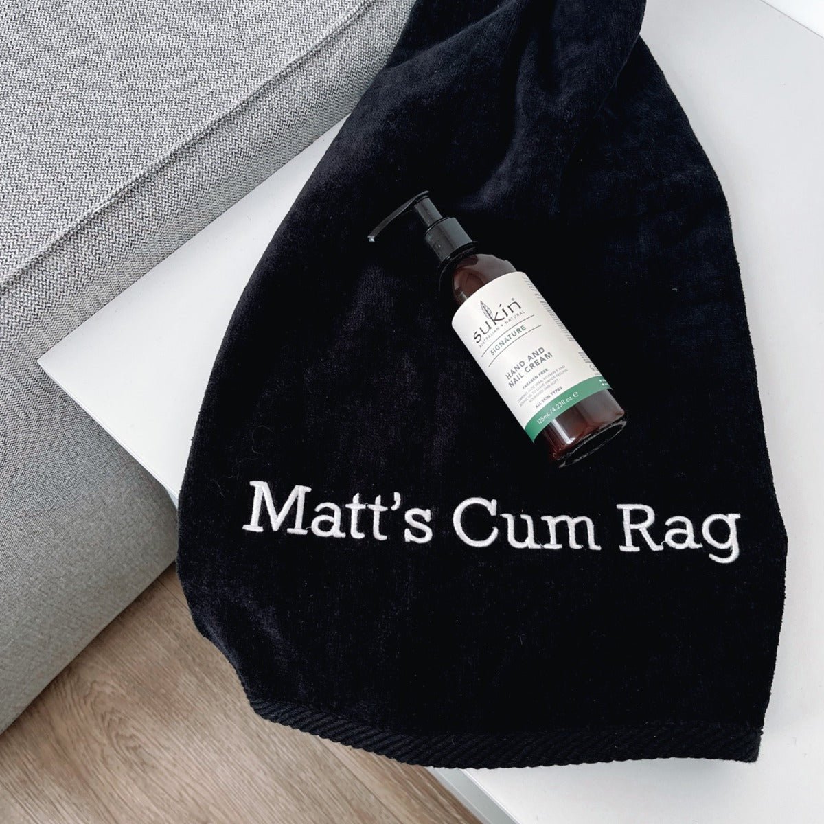 Professionally embroidered with your choice of personalised name and embroidery colour. our cum rag towels come (pun intended) in a sleek black colour and are the perfect size to fit compactly in your bedside table.