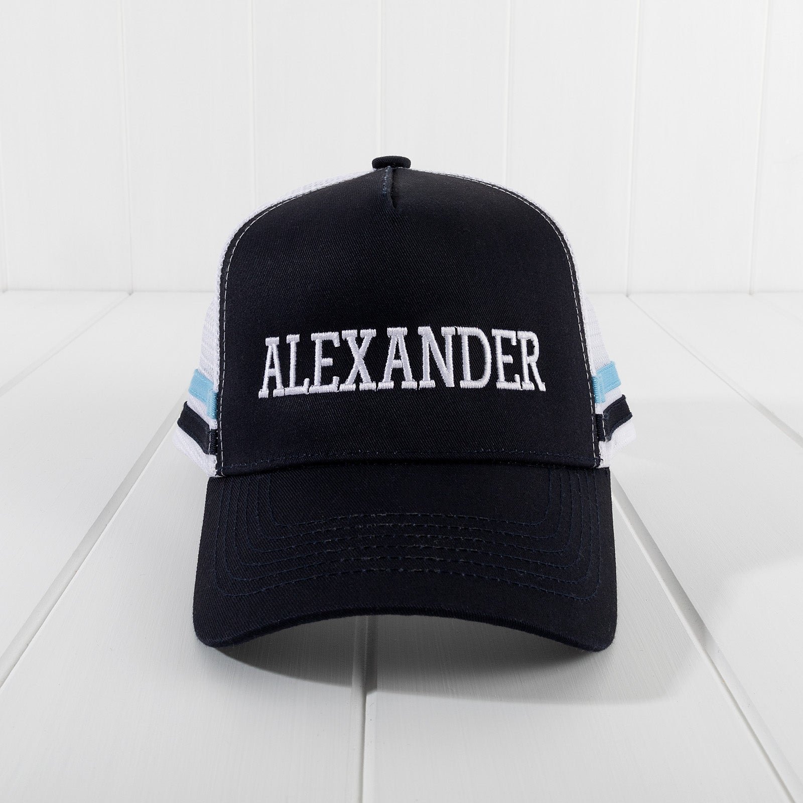 Kids will look and feel cool in our navy striped trucker cap! Made from soft polycotton with a breathable mesh backing. this cap combines comfort and style. It features a structured 5-panel design with two stripes on each side. The cap is embroidered with your child’s name. nickname or initials. making it uniquely theirs.