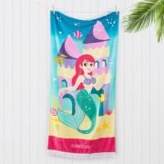 Crafted from a soft and absorbent cotton. this beach towel features a sweet little mermaid waiting to join your little one as they dry off from their seaside or poolside adventures.