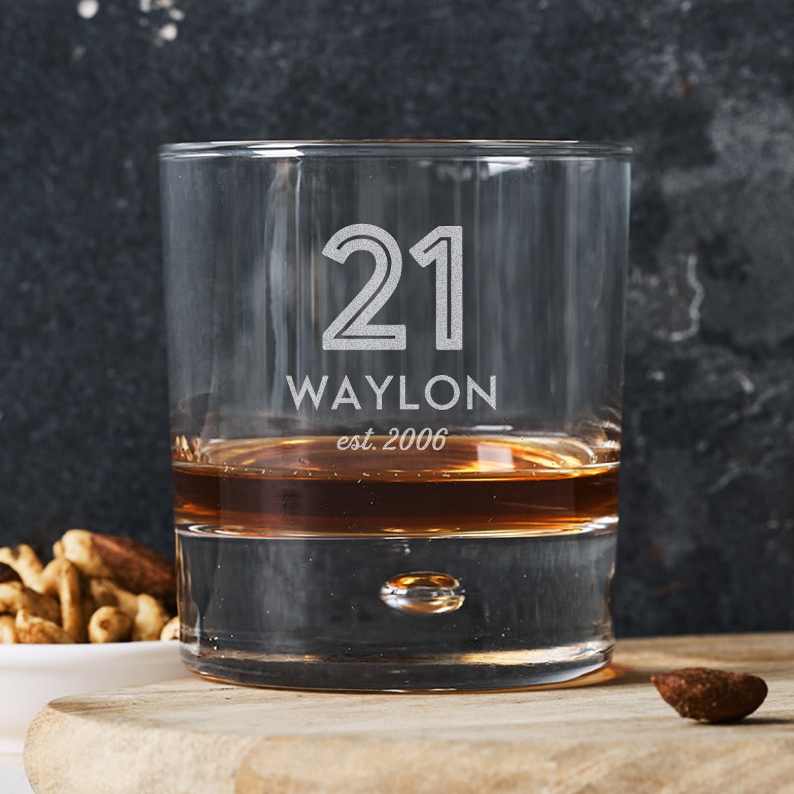 Toast to their 21st birthday with a personalised whiskey glass! This 305ml round whiskey glass is perfect for whiskey. bourbon. scotch. or any favourite spirit. Laser engraved with their name. date. and a unique design. it’s a keepsake they’ll treasure for years.