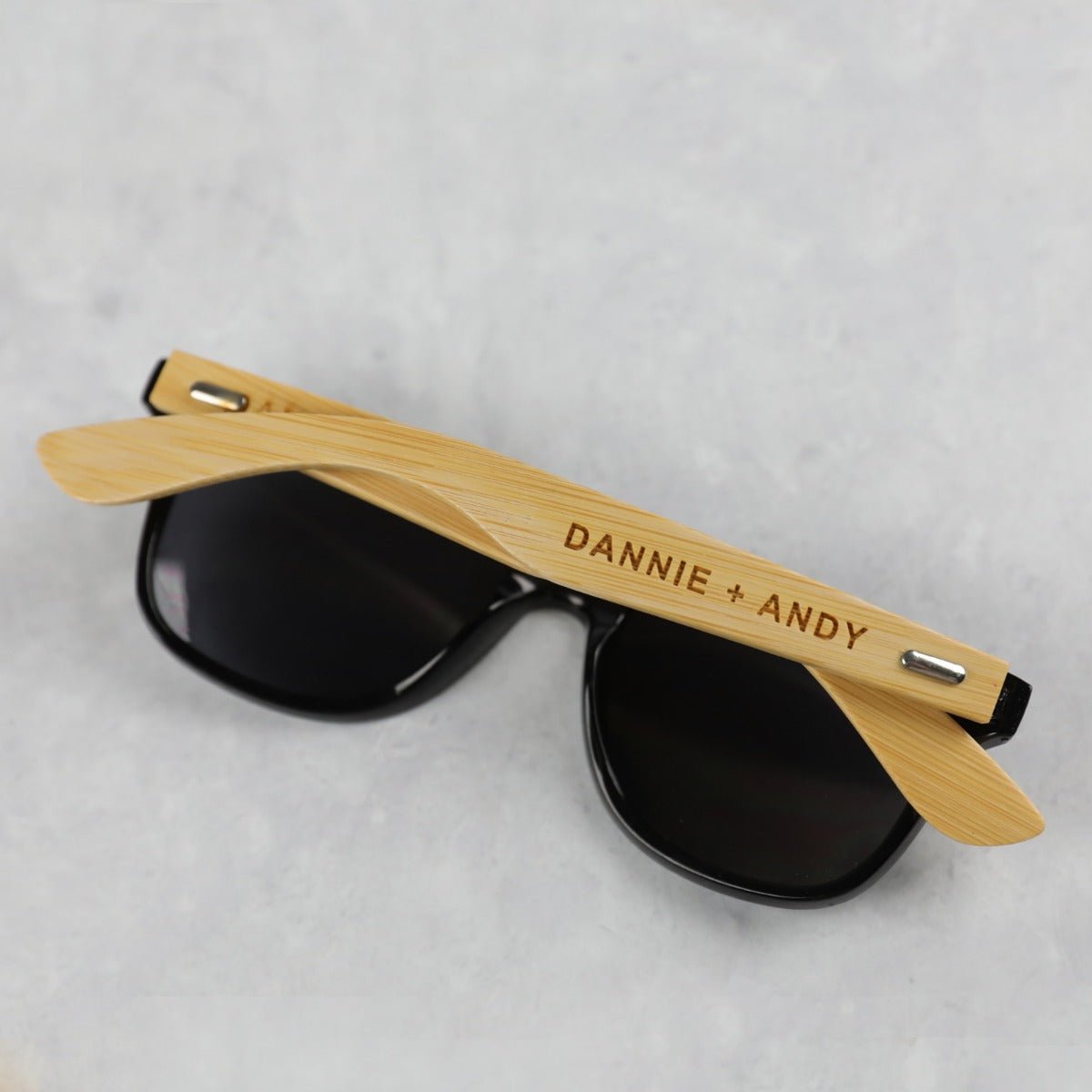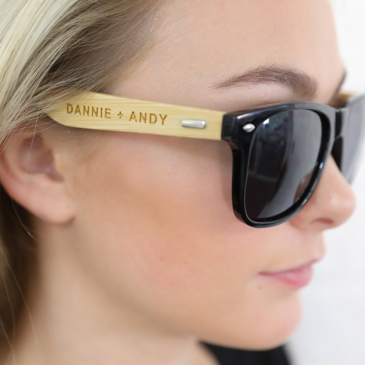 Customise your wedding favours in quintessential style. with engraved bamboo sunglasses for every guest!