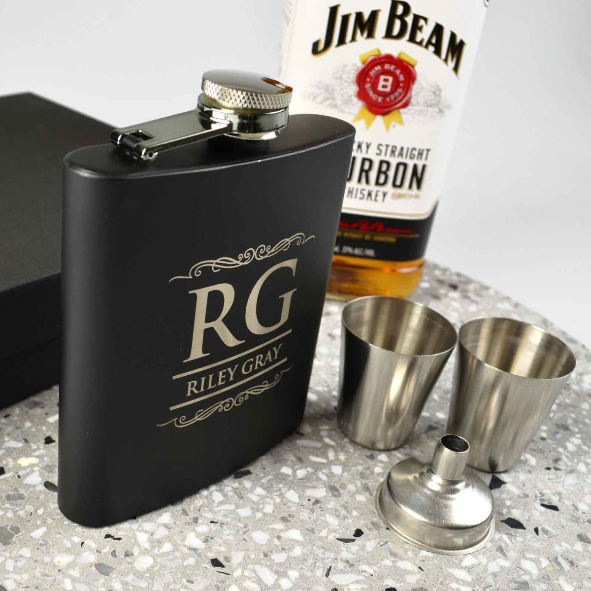 A practical and personalised birthday present. the sleek black hip flask is professionally laser engraved with the recipient’s name or other personal details in your choice of design. A gift that is truly customised for their spirit!