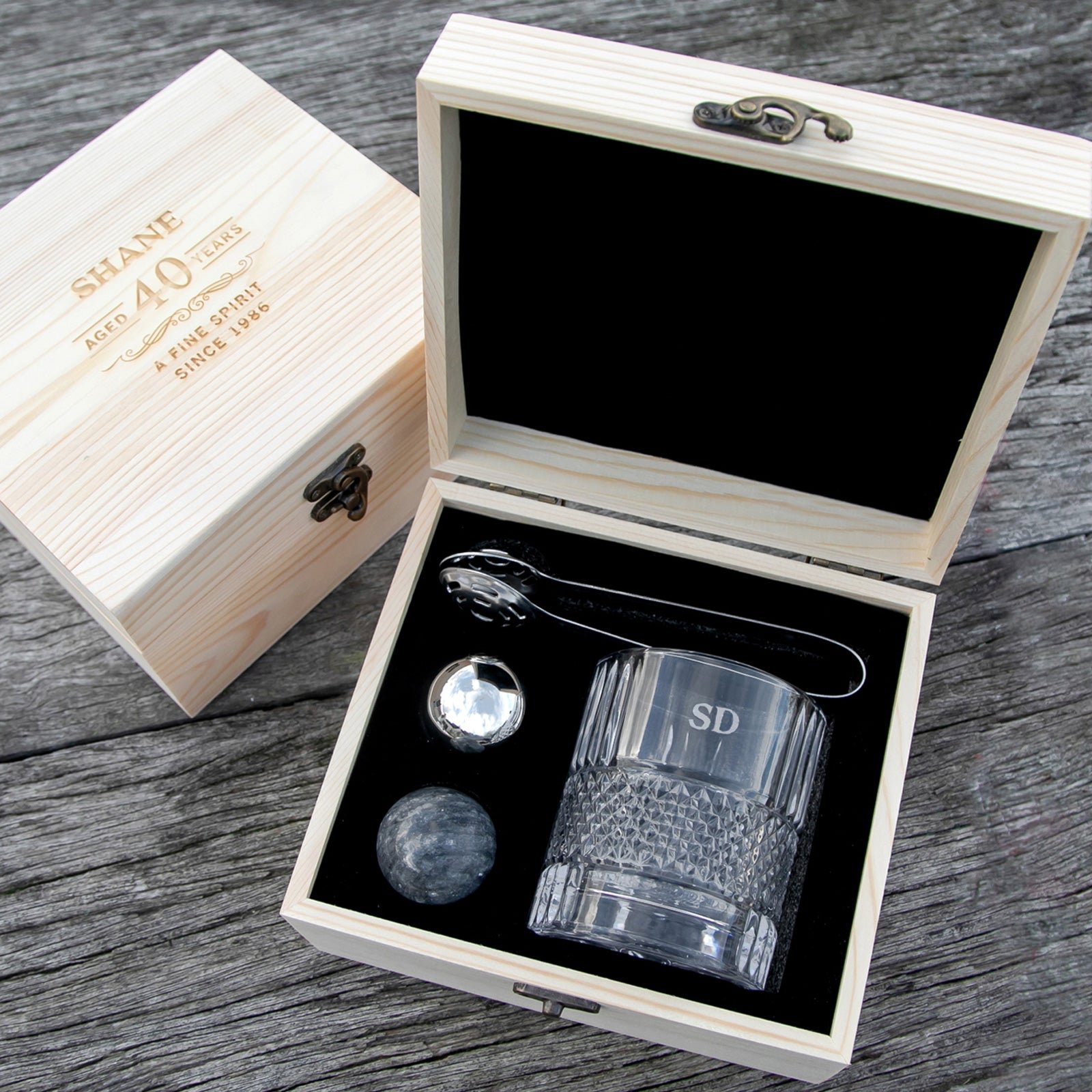 Not only is this a unique and personalised birthday gift. but it also provides entertainment value at parties and it is a great conversation starter. To celebrate the recipient. have their initials. name. special date or custom message engraved on both the wooden box and spinning Scotch glass set.