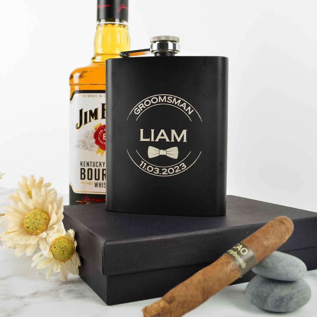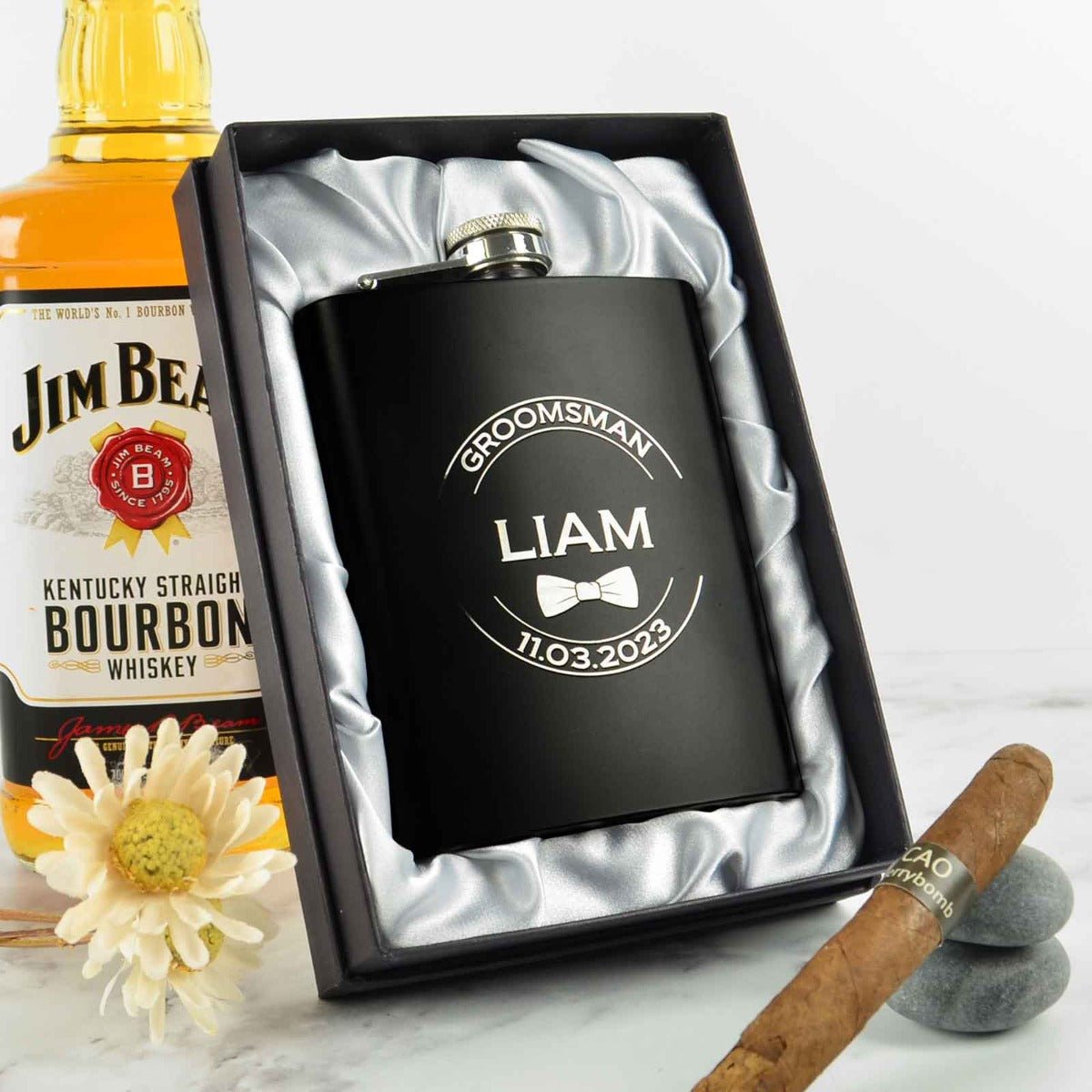 Eat. Drink and be Merry! Engraved Bridal Party Black Hip Flasks are a classic gift for the Groom. Best Man. Groomsman or other special family members such as Father of the Bride or Groom.