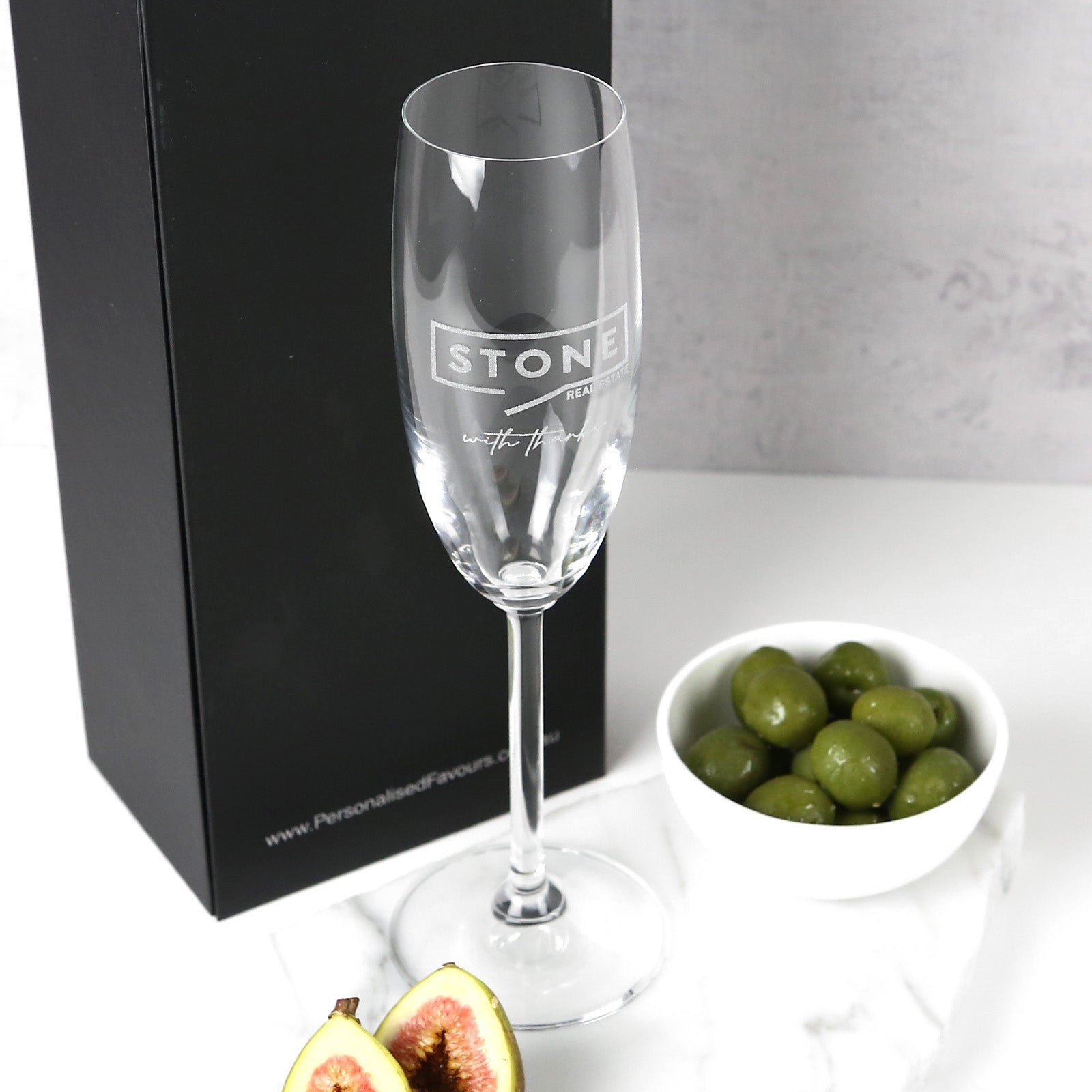 Crafted from high quality European glass. the elegant lines of the champagne flute are the ideal offset for the personalised engraving that can grace the outer surface. A blank canvas upon which to inscribe your business name. logo or other pertinent details; this is a gift that will suit all occasions.