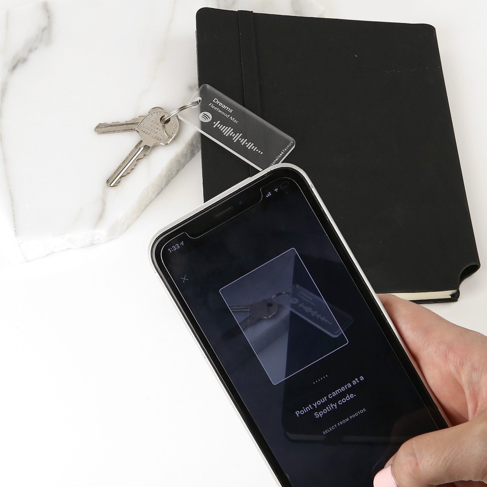 This personalised Spotify acrylic keyring is an original and inspired gift idea. Made from 3mm thick frosted acrylic. the keyring is engraved with a scannable spotify code and artist’s name of your choosing.