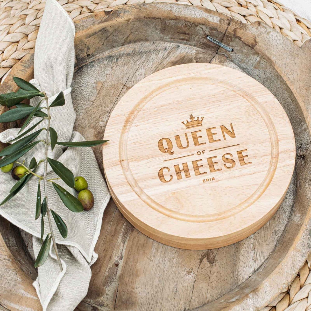 Made from a beautiful natural wood. the round cheese board is professionally engraved with a choice of eight (8) unique designs. all personalised for the cheese loving recipient.Â