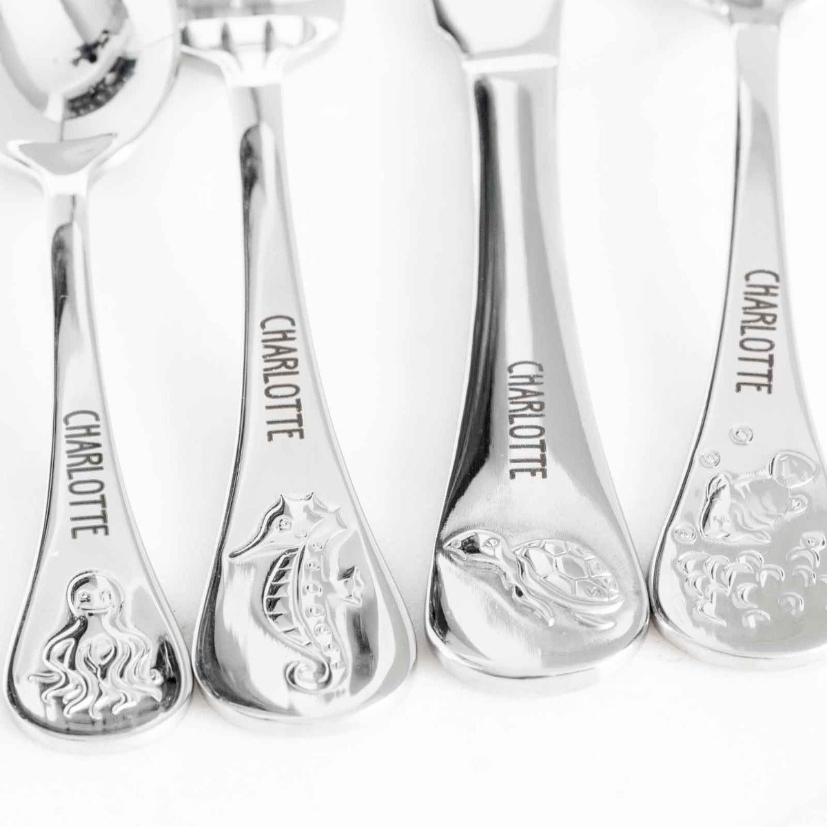 Containing a knife. fork. spoon. and teaspoon. each with an embossed sea animal and professional laser engraving of your child’s first name. this set will make your child feel proud as they place them on the table ready for mealtime.