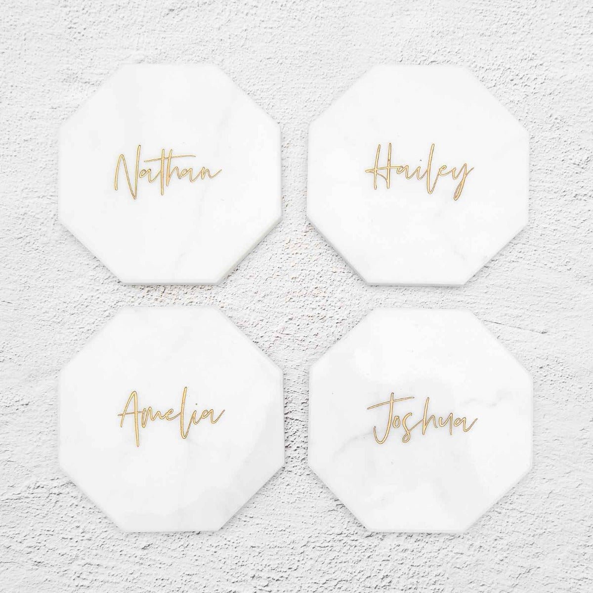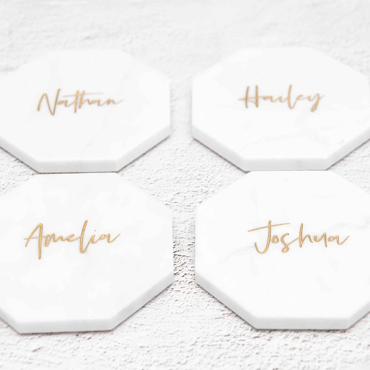 Add a touch of timeless elegance to your wedding tables with our White Octagonal Marble Coasters. a stunning combination of place card and keepsake. Each coaster is professionally laser engraved with your guests’ names and colour in-filled with a luxurious metallic gold. creating a personalised detail that enhances your wedding décor.