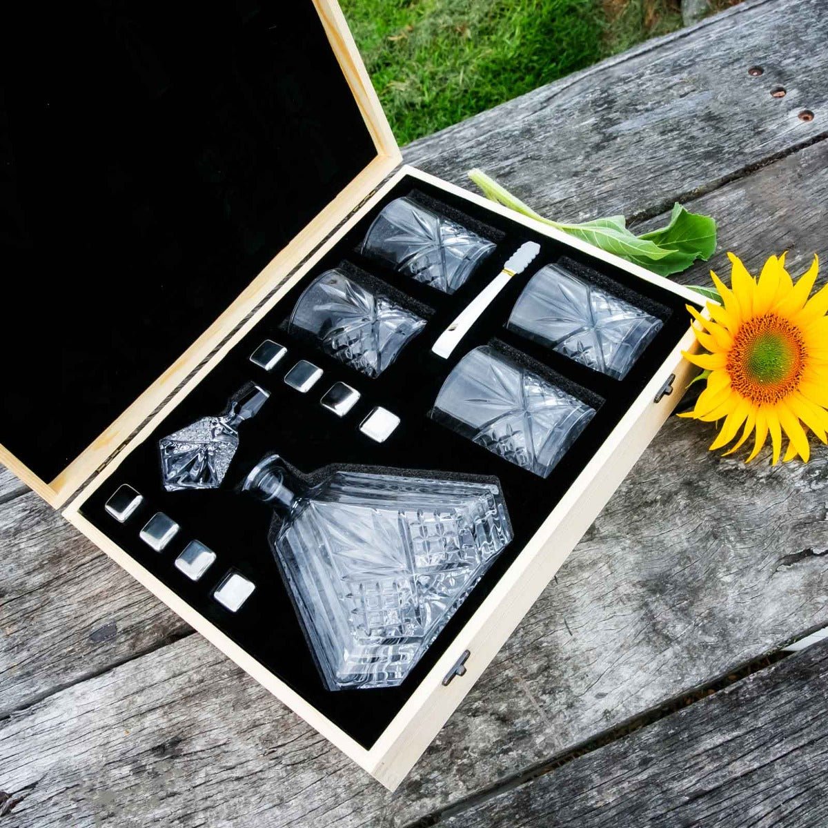 Included in this amazing wow-factor gift is one 650ml Crystal Cut Decanter. four 310ml Crystal cut Whiskey Glasses. eight silver Whisky Stones. one set of Whisky Stone Tongs. one Black Velvet Whiskey Stone Bag and one Personalised Wooden Giftbox.