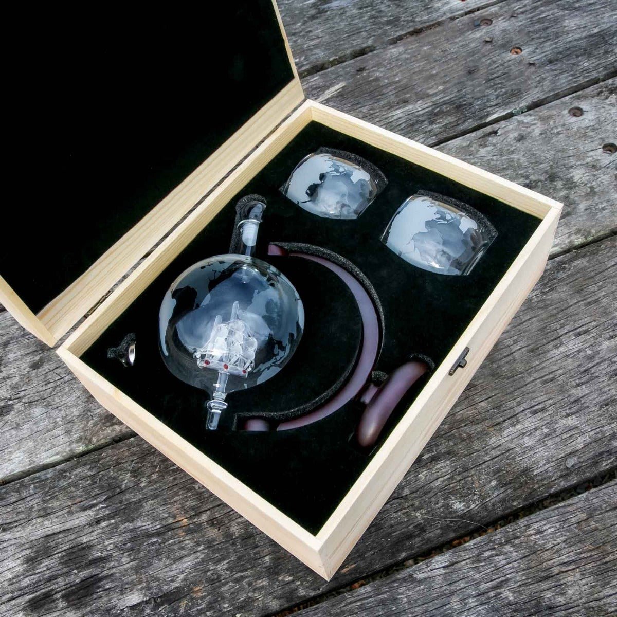 Our effortlessly stylish and generous 850ml Globe shaped decanter includes a glass stopper and an easy pour funnel for less spilling and more sipping. With a beautiful image of the world map etched on the exterior. the interior of the decanter has an antique sunken ship. waiting to set sail once more. in your favourite pool of liquor. Ready to share with another. this unique gift comes complete with two matching hand-blown glasses with a volume of 300ml. all pieces elegantly presented and ready to gift in a keepsake and customised Engraved Wooden Giftbox.