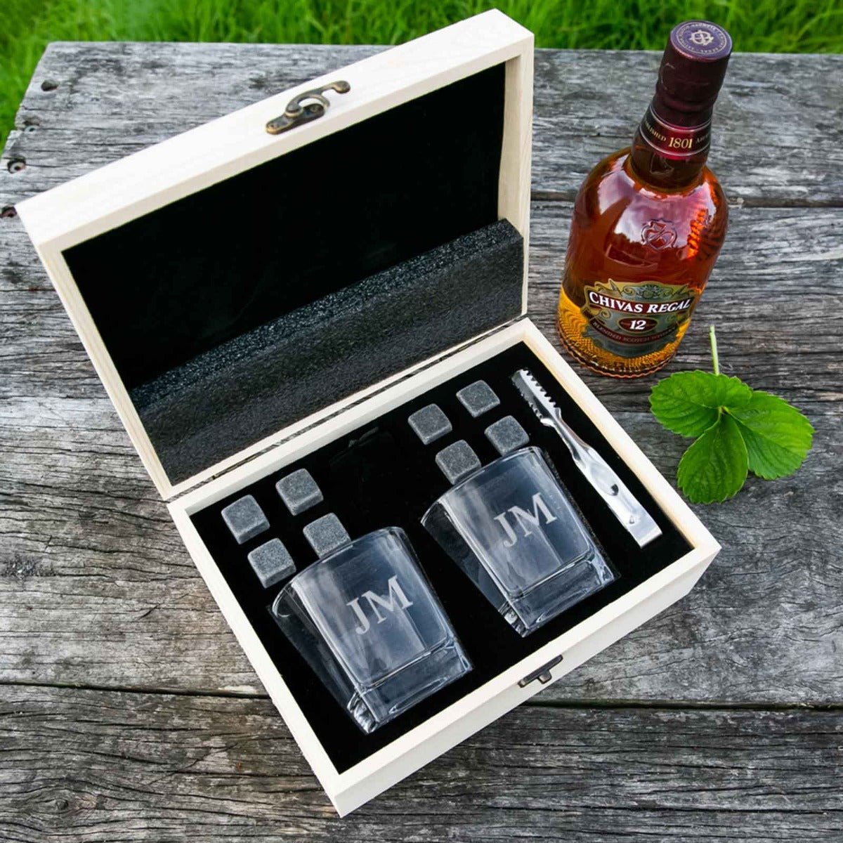 Including two personalised. premium square scotch glasses. eight whiskey stones and one black velvet whiskey stone bag all encased in a classy wooden gift box. this is the gift that will leave a smooth smile on their dial.