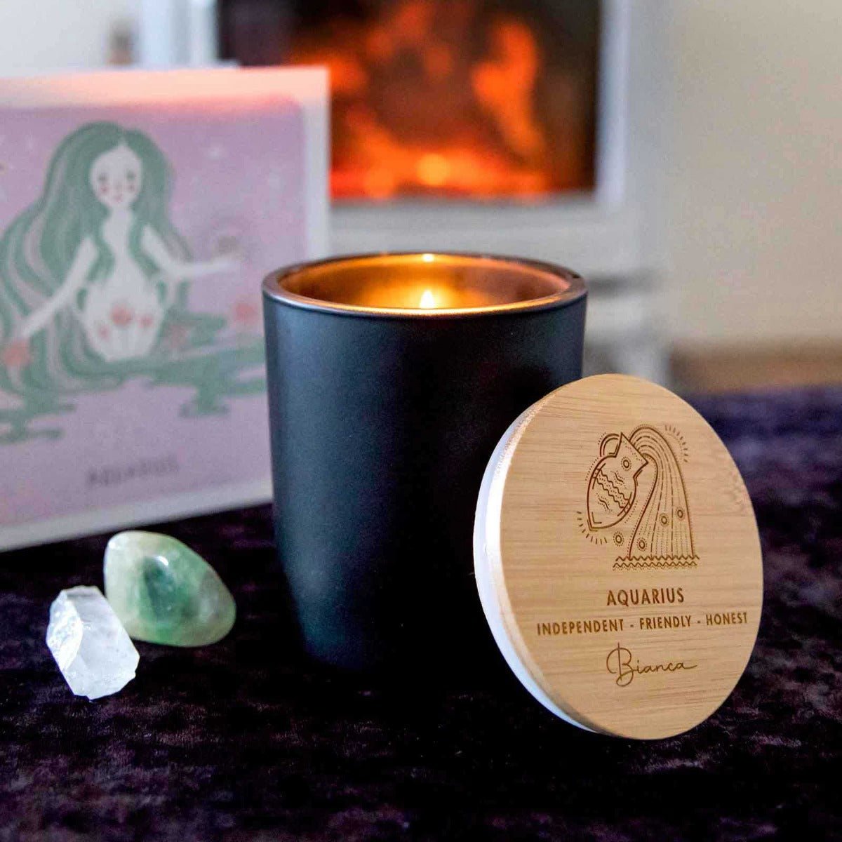 Choose from a black or white candle housing and have the name of the new owner professionally laser engraved on to the wooden lid – complimenting the Aquarius inspired artwork – to create an original and unique gift the beneficiary will love to receive.