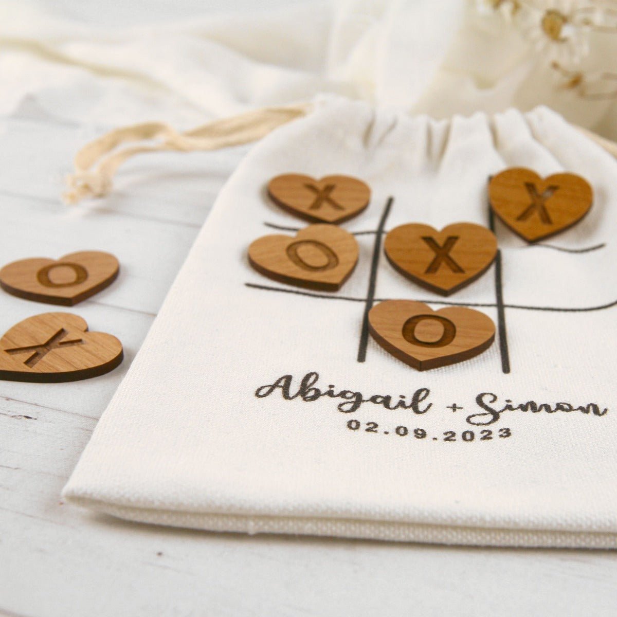 These game pieces are made from stunning Alder wood. and each set includes four noughts and four crosses. Best of all. the set will double as a beautiful. engraved wedding favour that each guest will get to take home. and comes in a printed calico bag that can feature your name and wedding date.