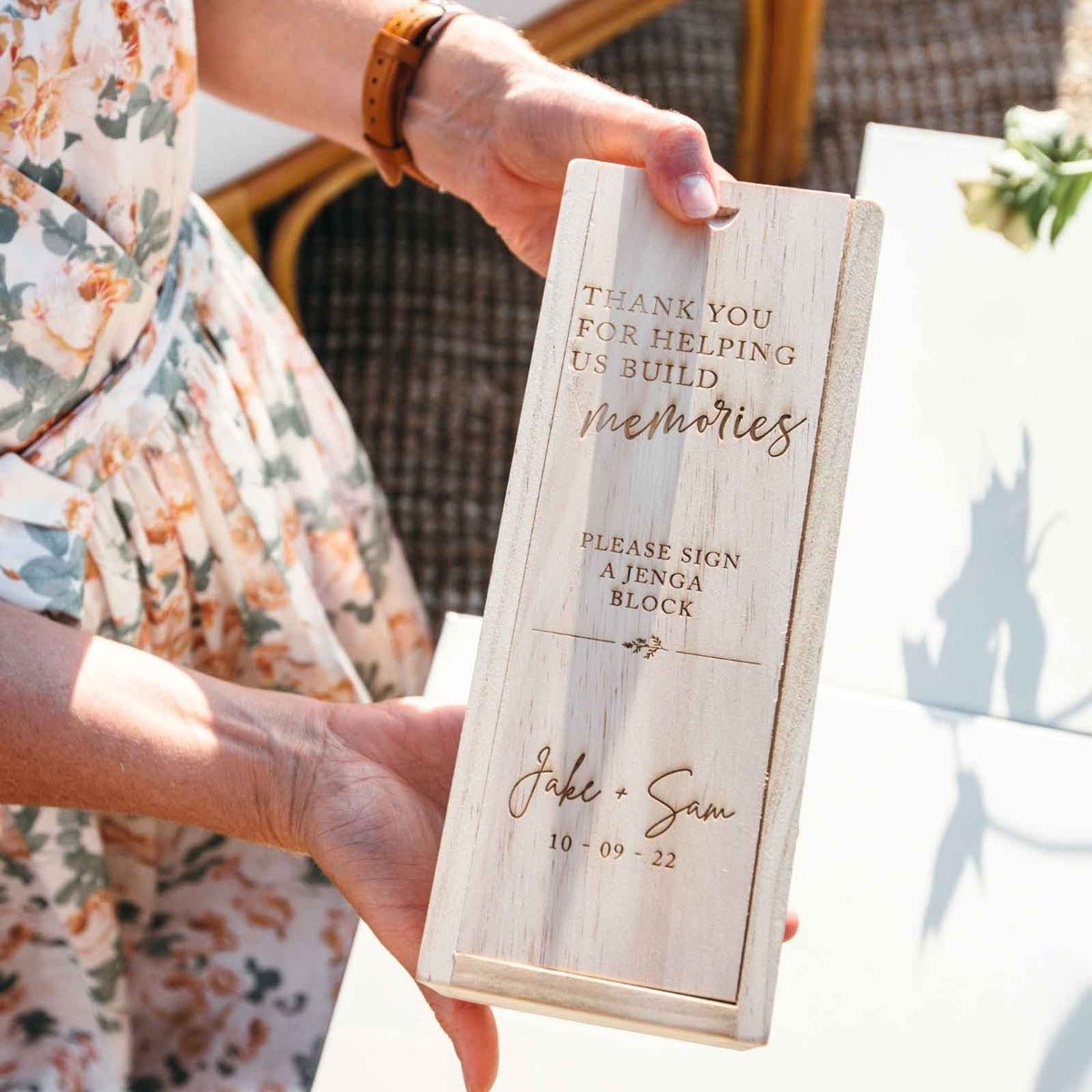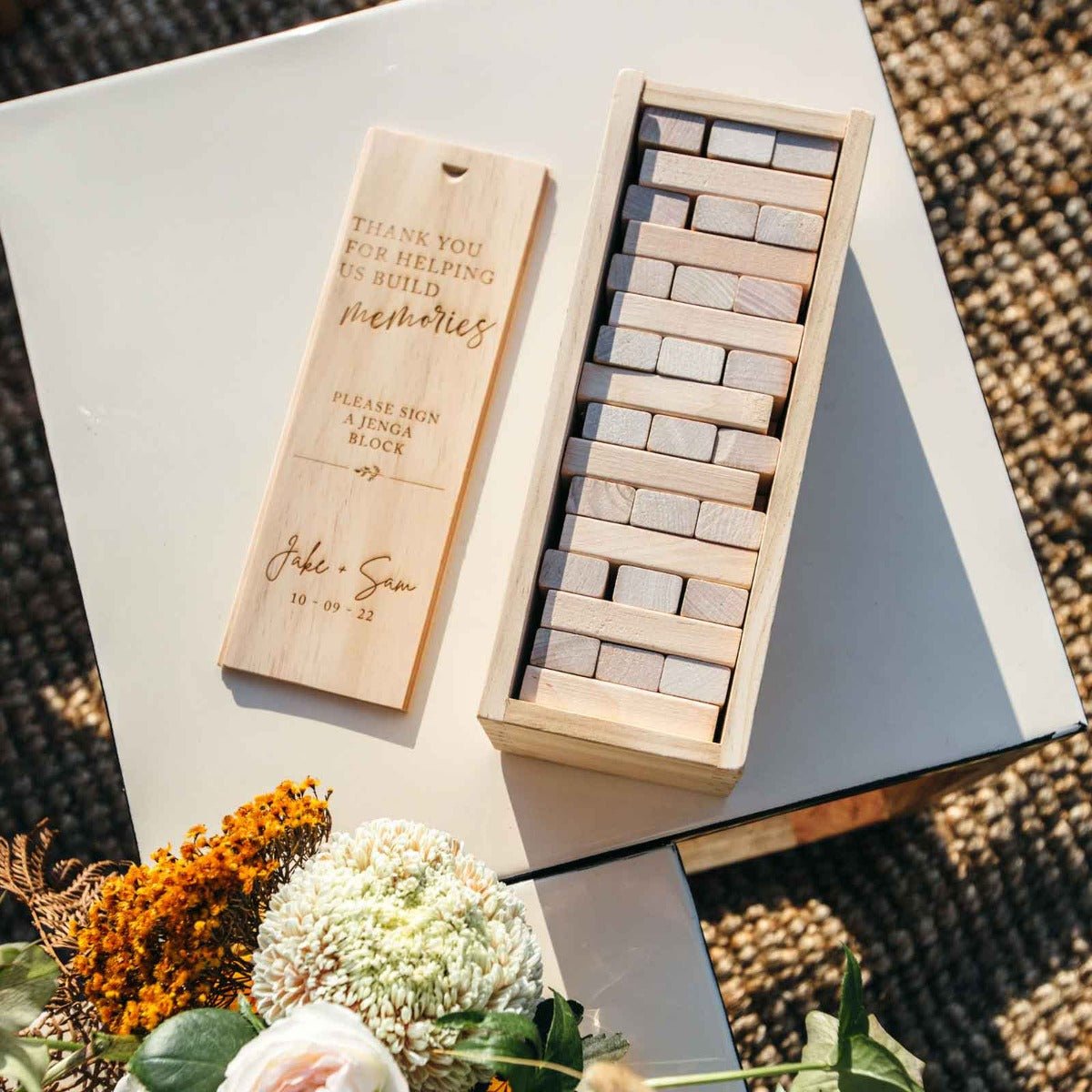 Doubling as a fun and interactive game during pre-wedding drinks or throughout your festivities. this Jenga-style guest book will be a memorable focal point of your wedding celebrations.