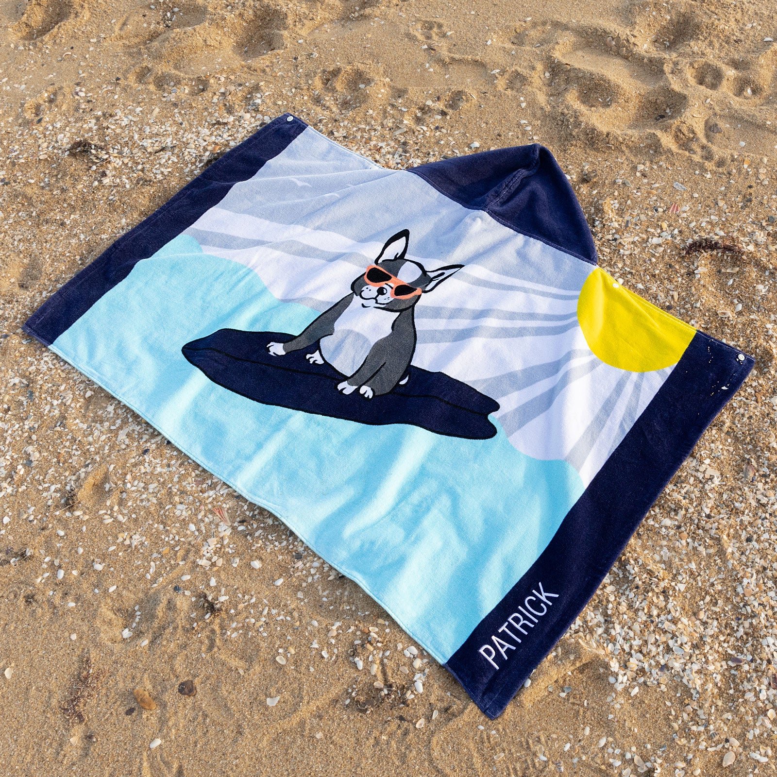 Stand out at the beach or pool this summer with a design like no other. the French Bulldog embroidered kids hooded beach towel. Made from 100% cotton. this 340gsm towel is both soft and absorbent and will dry out in no time. The hood has two side buttons to keep it in place. Allowing you to go straight from the beach or pool to home without having to change.