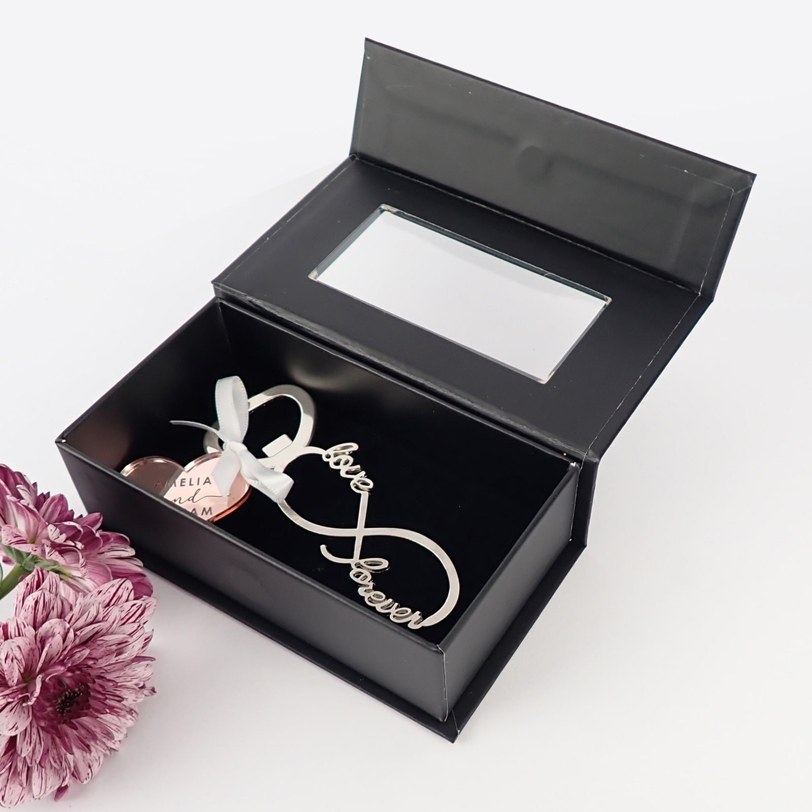 Paired with an engraved mirror silver. mirror gold. frosted. clear or black acrylic heart-shaped gift tag. it is a charming bomboniere option that is both unique and functional.