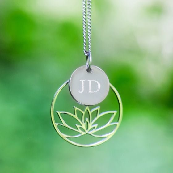 With a base of stainless steel and the option to choose a silver or 18ct gold or rose gold plated finish. the clean lines of the lotus flower are perfectly presented. Provide the initials. up to a maximum of two (2) characters. you wish to appear. and they will be professionally laser engraved onto the circular pendant. Complete the look by choosing the chain length most befitting and you will have crafted a truly exquisite and personalised piece.