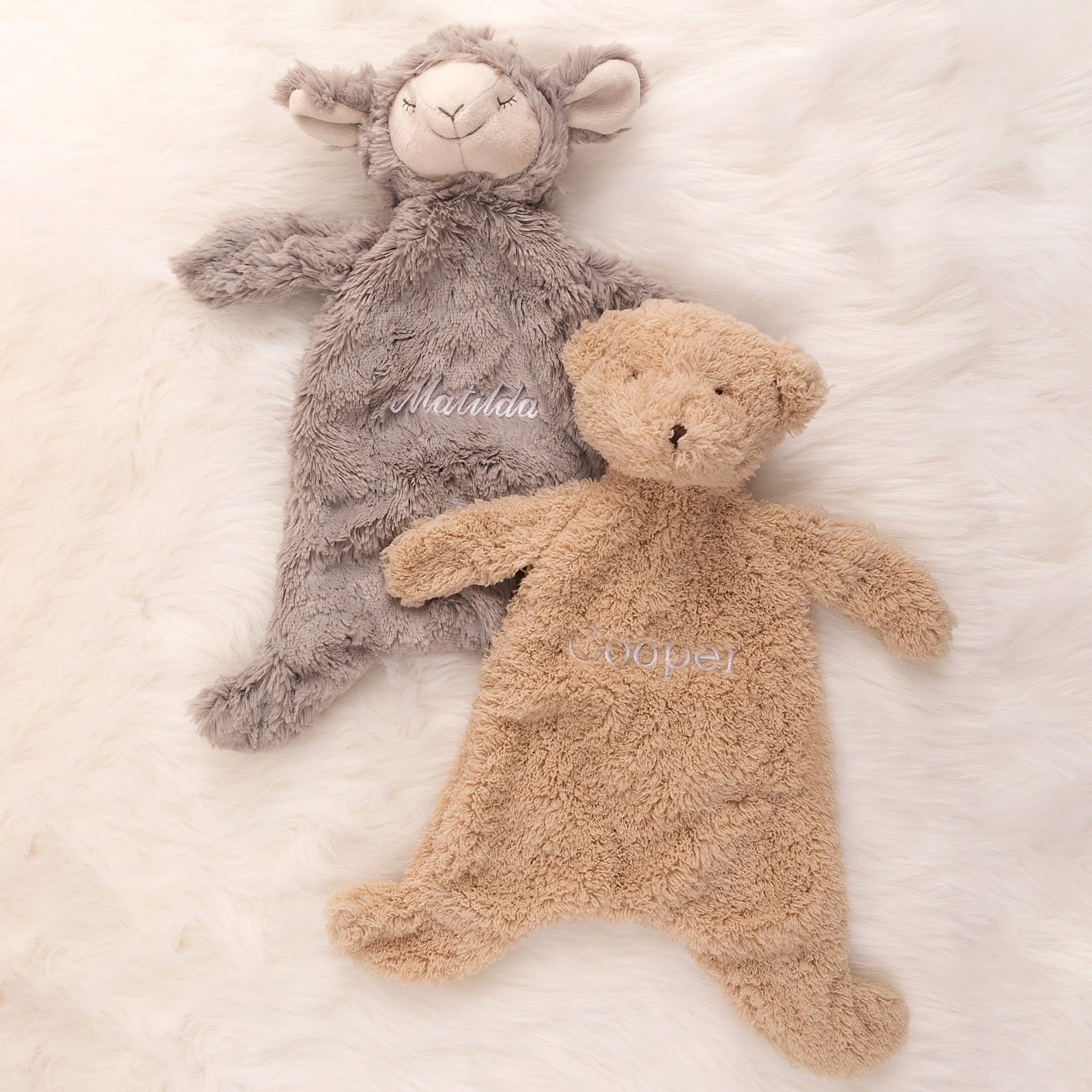 This personalised Plush Bear Comforter Toy is designed especially for newborns and older children and tested to AU/NZ Safety Standard for toys. We love that your little one can snuggle in their cot with this plush bear lovey and it is light weight and squishy enough to cuddle during nap time at home. at their childcare centre or while they snuggle with family members.