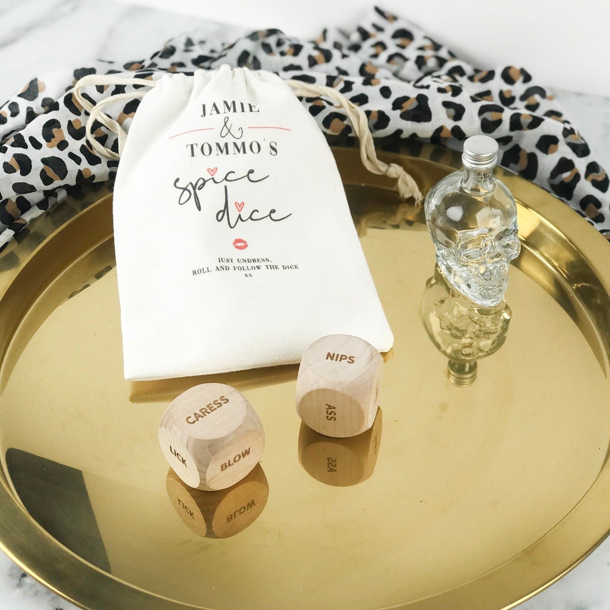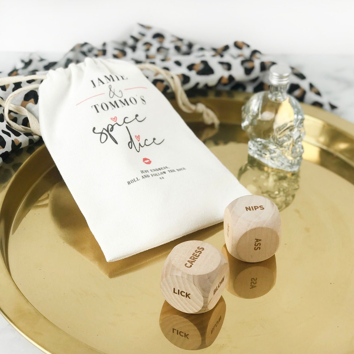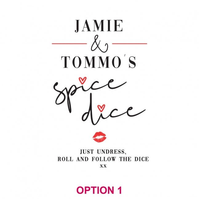 Turn up the heat in the bedroom with our spicy date night dice game. The game includes two engraved wooden dice and a personalised calico gift bag. Each face of the dice is engraved with a word that becomes an instruction of what to do with your partner. Roll the dice one at a time and it will reveal your next spicy move.Â