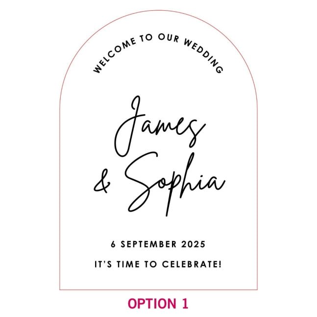 Featuring our infamous arch design. this contemporary wedding sign deserves a prominent spot at the entrance to both your ceremony and reception to guide guests as they arrive.