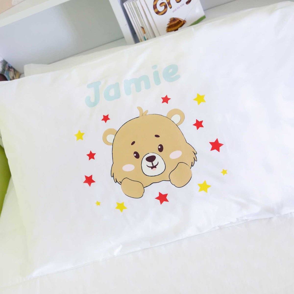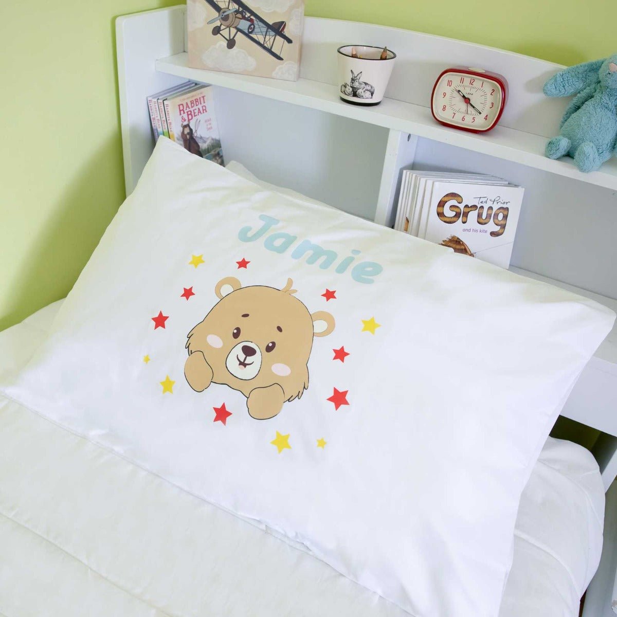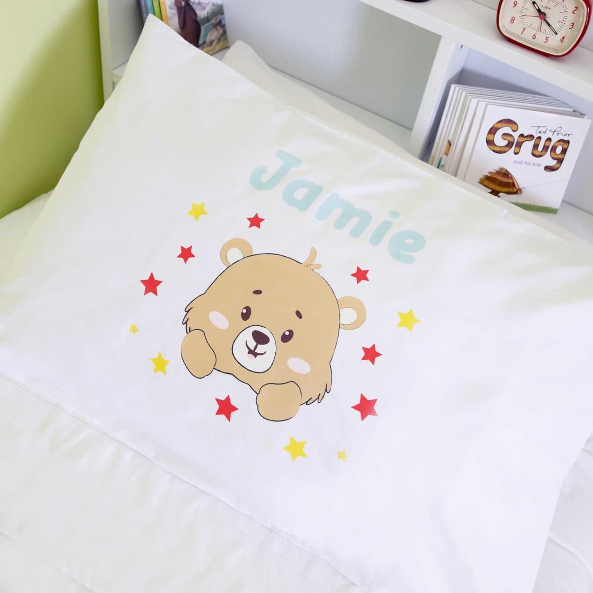 This lovely white pillowcase features a gorgeous teddy bear surrounded by red and yellow stars. sure to complement any child’s bedroom or nursery with its neutral and fun colour tones.