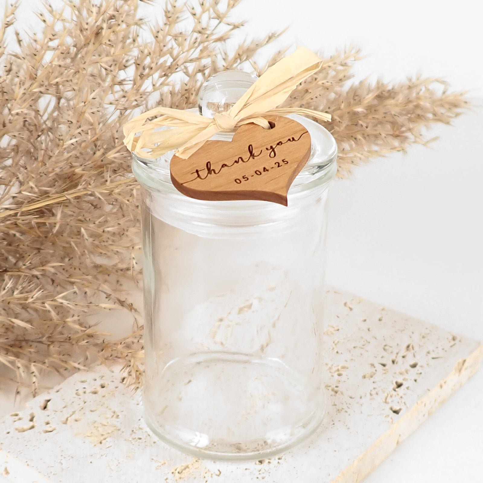 Each jar is personalised with a heart-shaped honey brown alder wood gift tag. which can be engraved with your guests’ names. the happy couple’s names. and your wedding date.