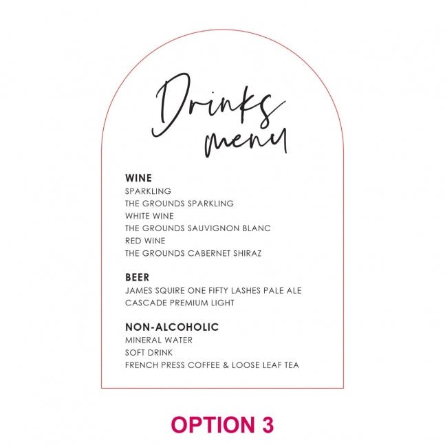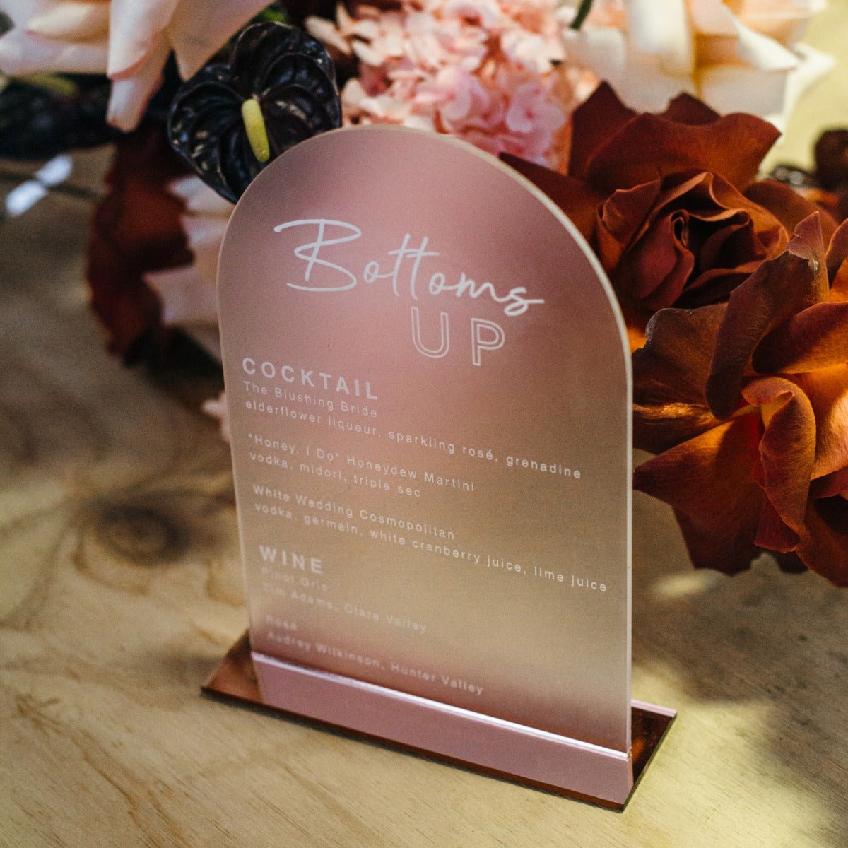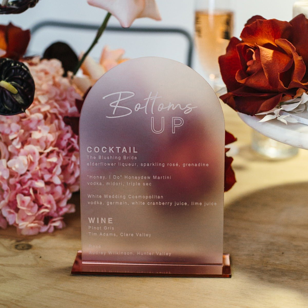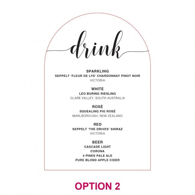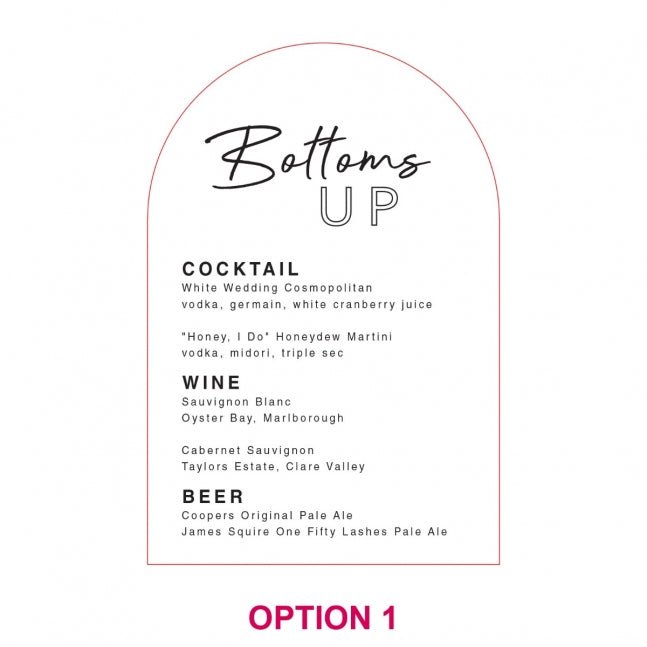 Style your reception bar with a personalised drinks menu sign to wow your guests. Feature your favourite cocktails. wine. champagne and beers that you are serving to help celebrate your special day.