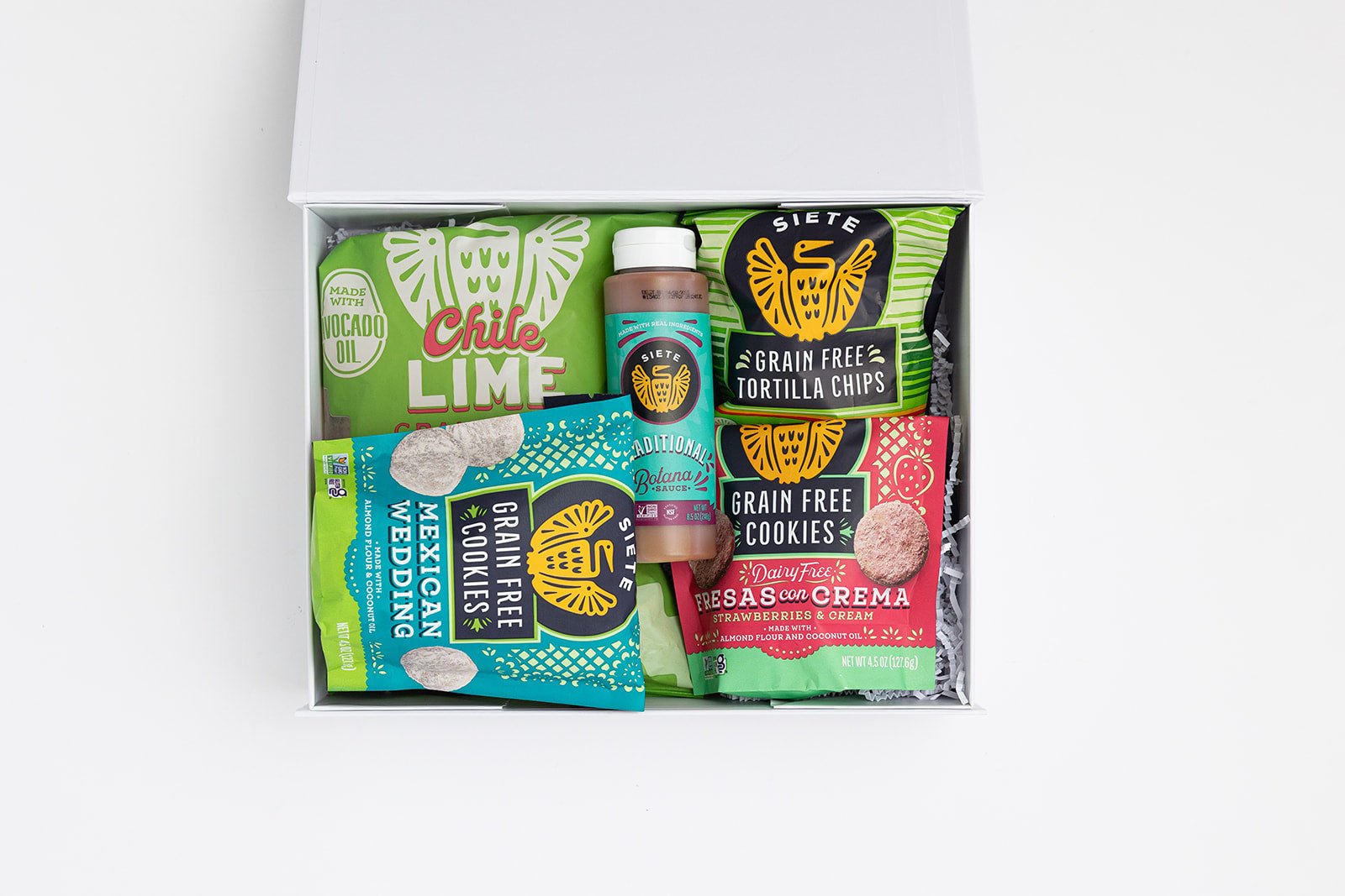 Discover the perfect gift for him. her. or them with our Siete Gourmet Gift Boxes. Curated with Siete Family Foods’ exceptional gluten-free treats. this festive taste of traditional Mexican cuisine features zesty Chile Lime Puff Chips. classic Lime Tortilla Chips. delicate grain-free Mexican Wedding Cookies. as well as a traditional Botana Sauce to level up your party’s flavors.Â