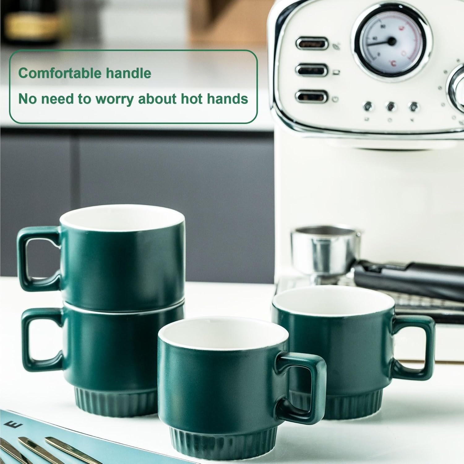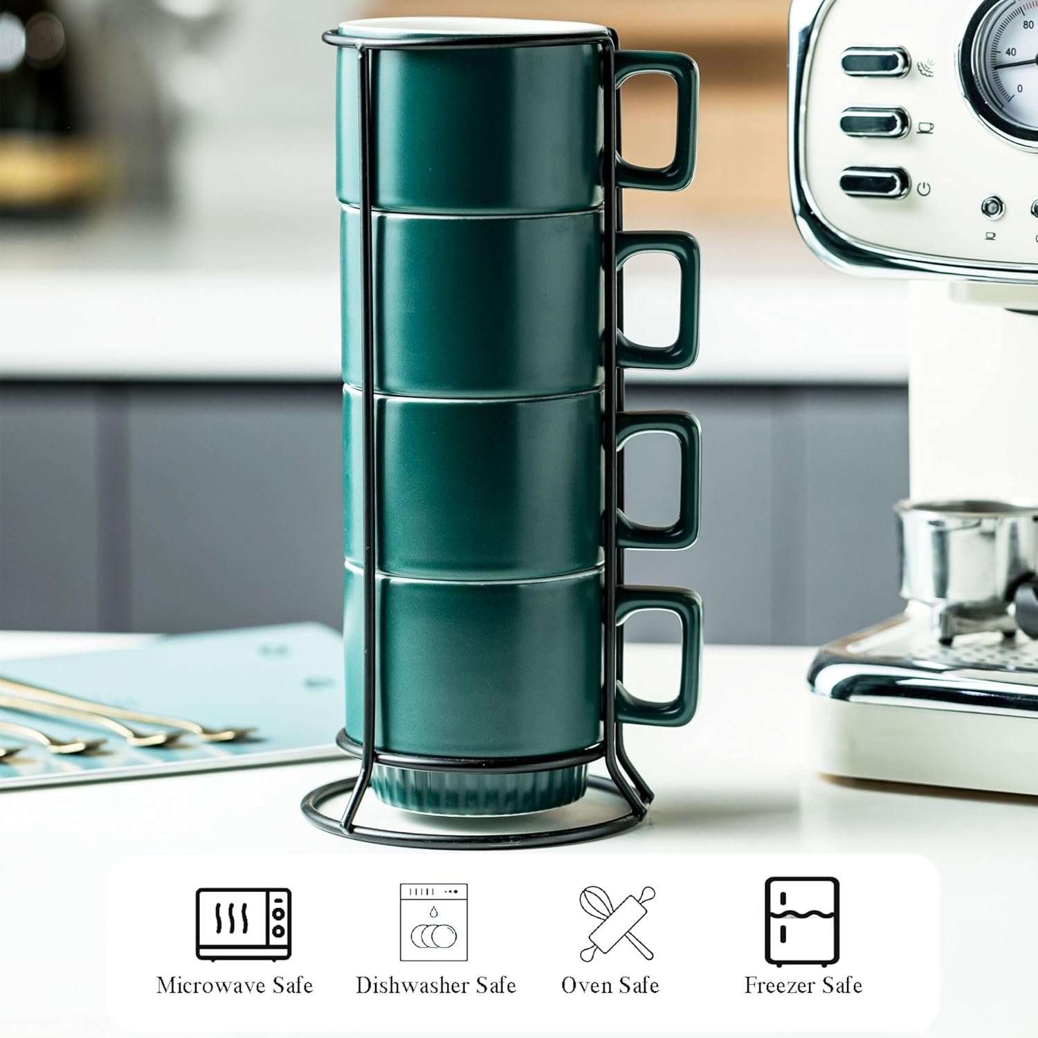 - Saving Space: These stackable coffee mugs are easy to store neatly and compactly. The intention of the stackable design is much more than space saving. And coffee cup holder holds more stable and transports easily for use anywhere. No more mess.