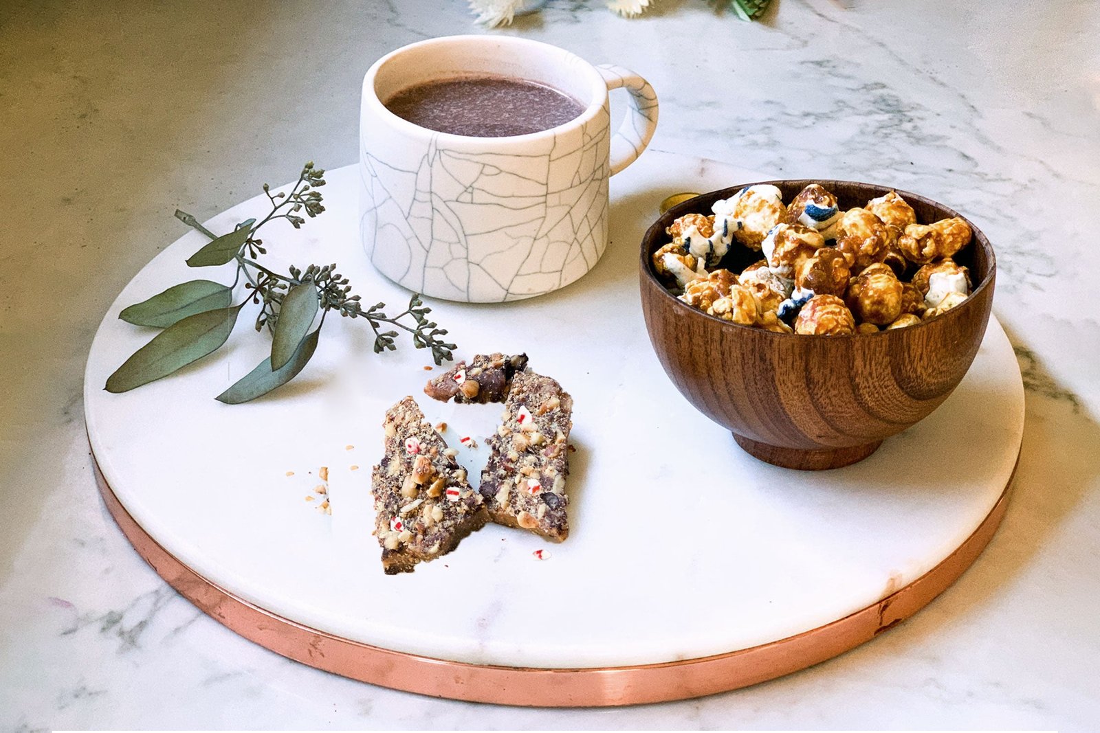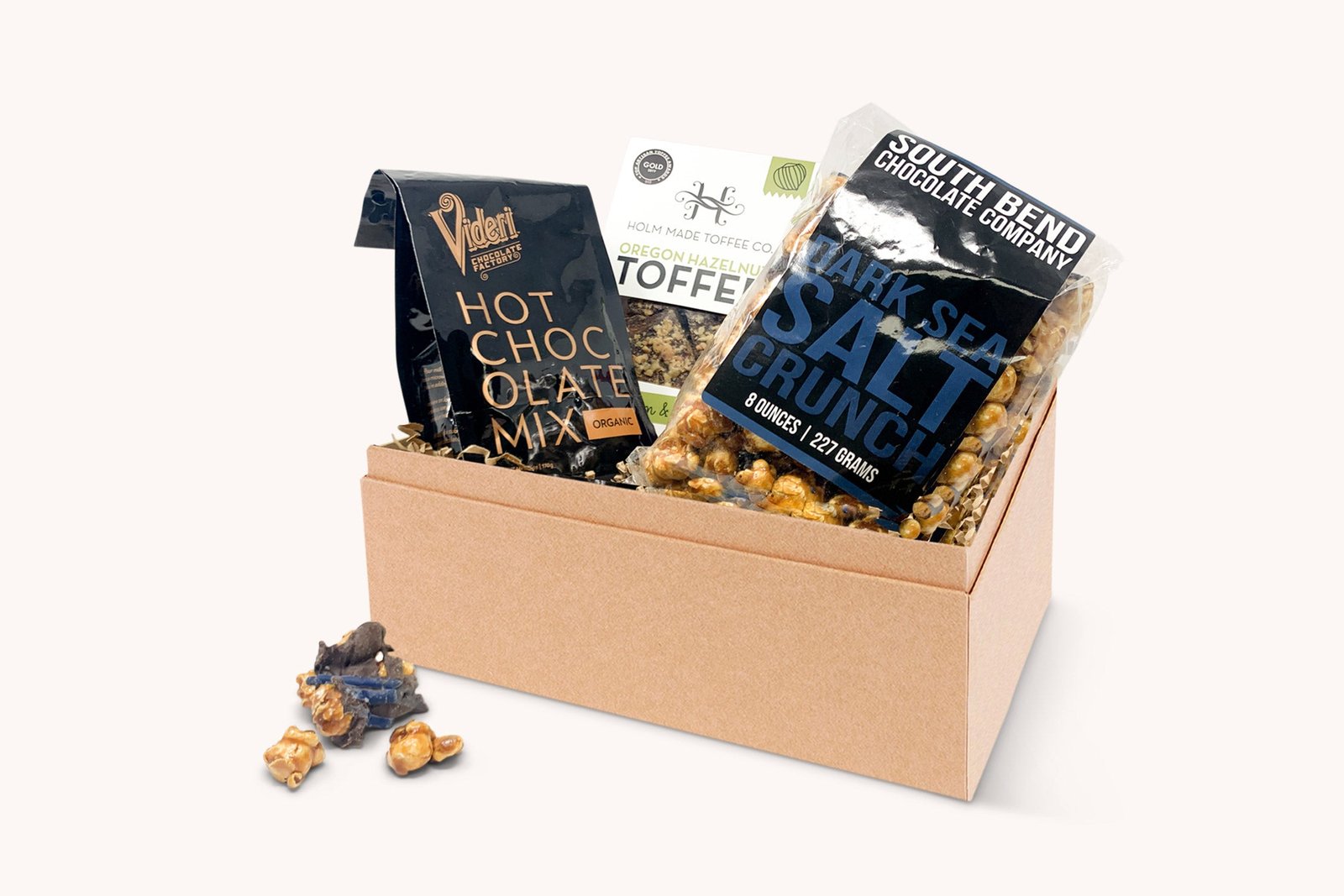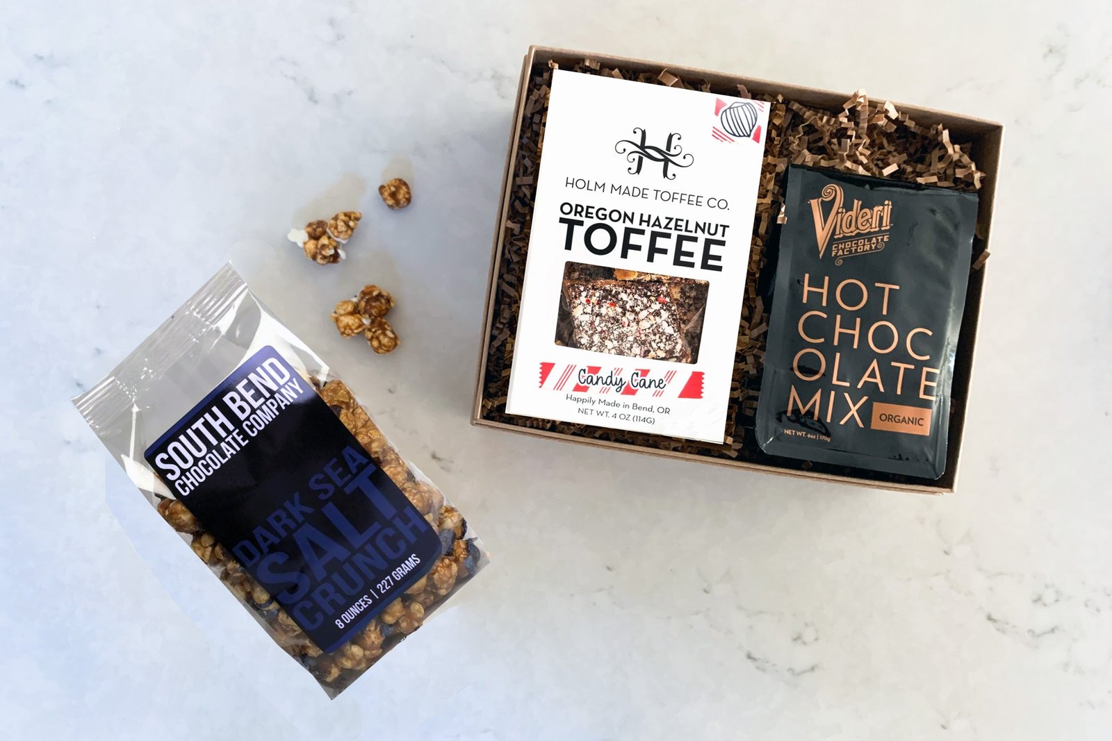 A perfect sentiment and pick me up that any gift box supplies. When you can’t get away to pick up the best of the sweet treats. we can send them for you. Bring on that fire and cozy up to salty and sweet dark chocolate drizzled popcorn. peppermint toffee that melts in your mouth and gourmet hot chocolate.