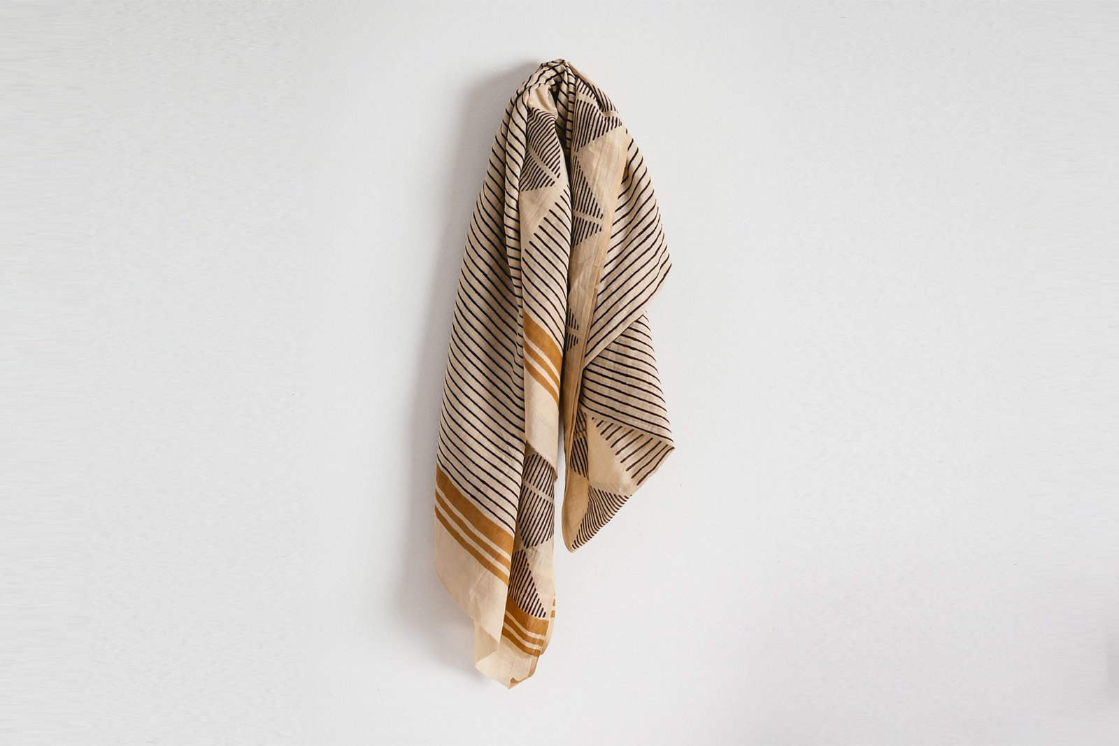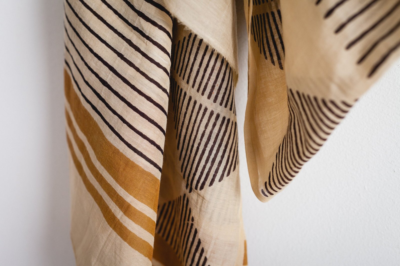 Block Printed Scarf printed by master block printers on the outskirts of Jaipur. India and designed by Tara Hogan. This beautiful Tulsi scarf is unlike anything she or he has in their closet. or on their wall. Made with natural non-toxic dyes. 34 x 86 in silk | cotton natural selvedge on length | raw edge ends. Care: hand wash cold water. air dry lay flat.