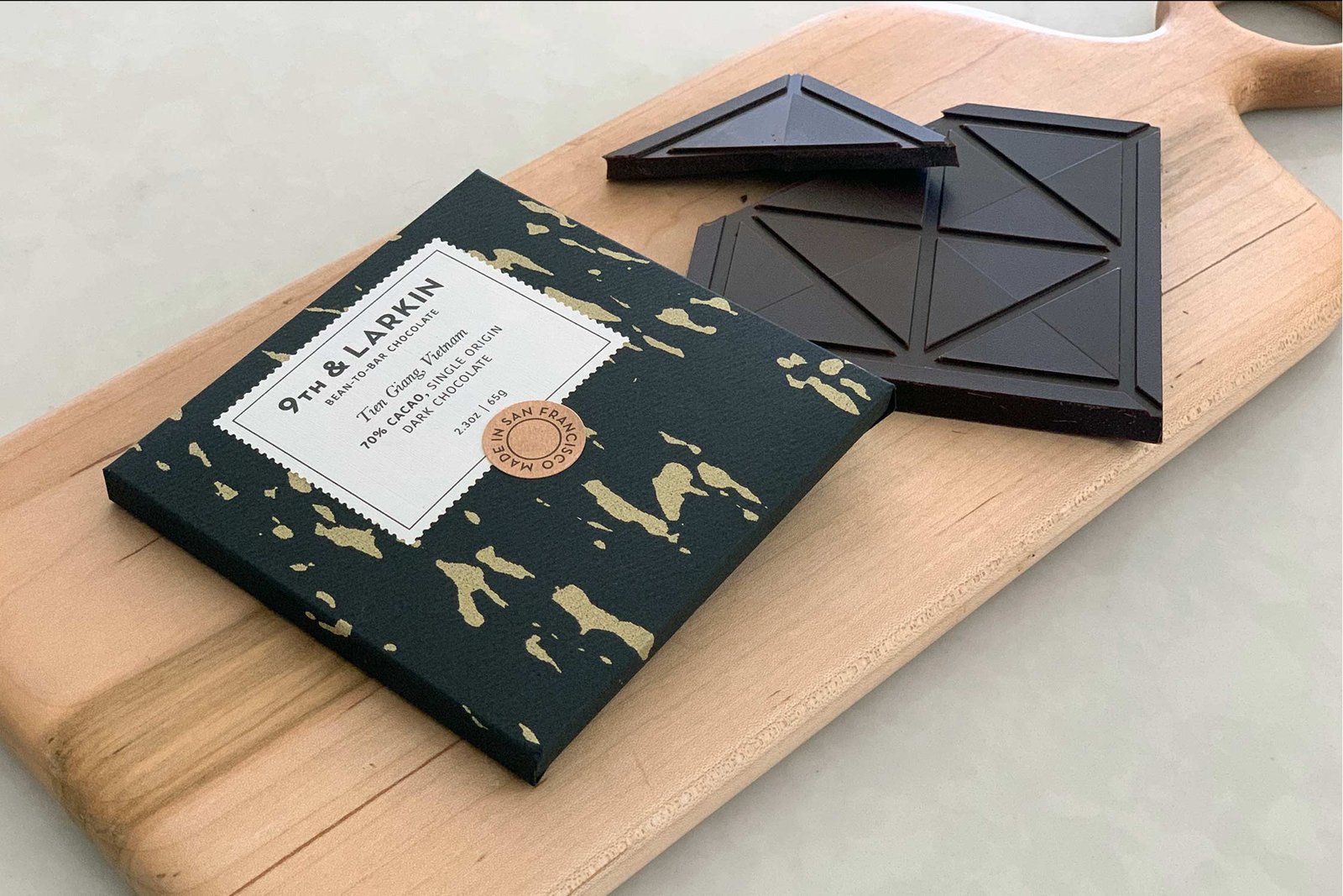 Tien Giang Chocolate is a signature bar of 9th & Larkin. Made with cacao beans sourced from Tien Giang. Vietnam. this bar has beautiful notes of brown sugar. nuts. cinnamon. with hints of figs and persimmon on a solid chocolate background.