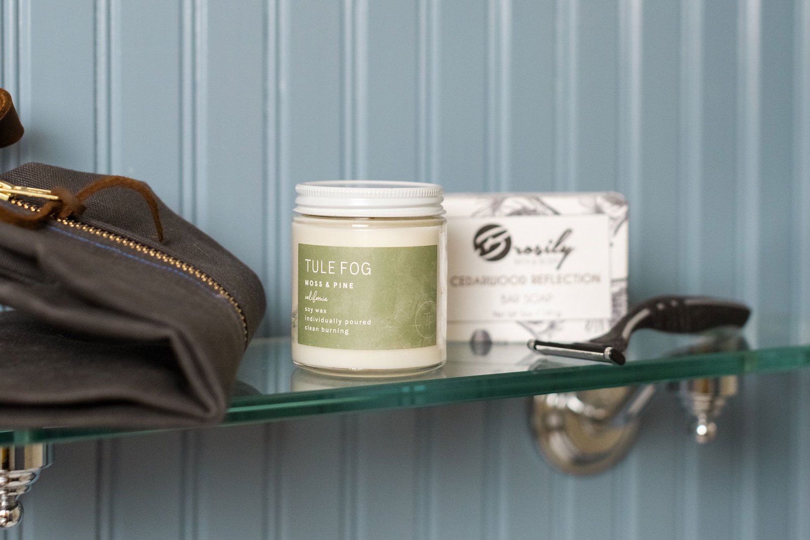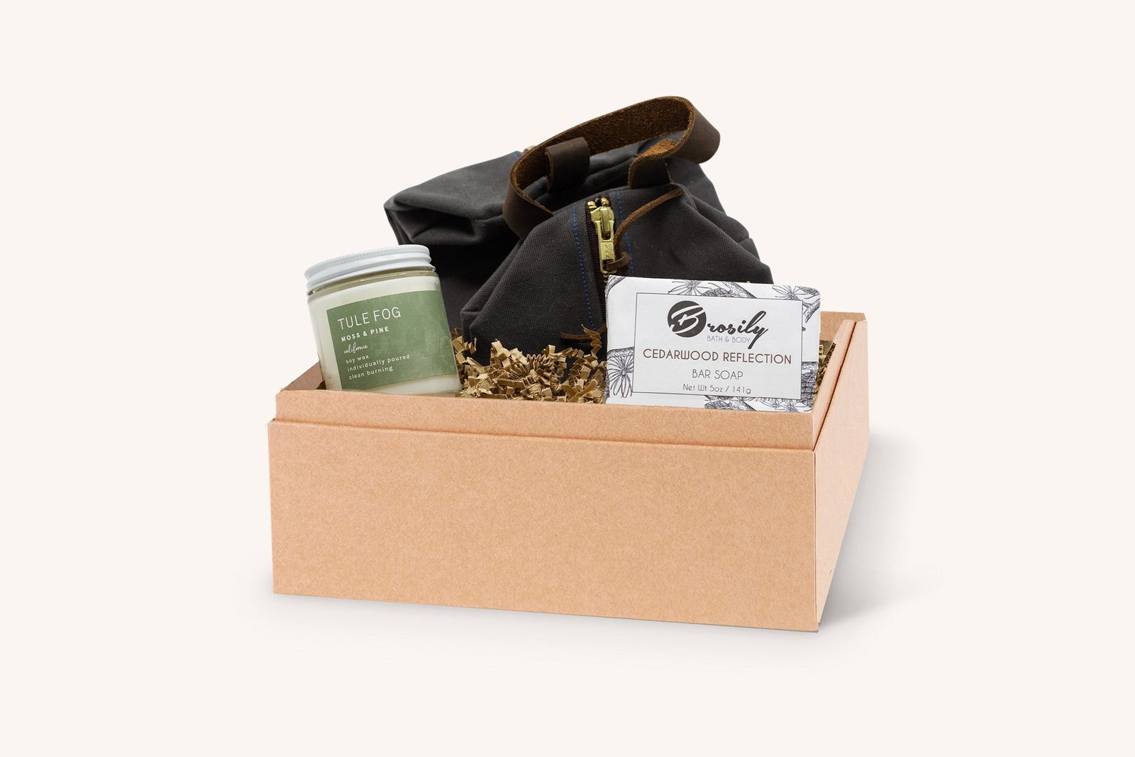 Traveling for a weekend getaway. a business trip. or for a long vacation requires proper tools and the place to store them! This canvas Dopp kit. Cedarwood soap bar. and Tule Fog candle provide the essentials for a trip away from home. with extra space to spare for travel supplies.