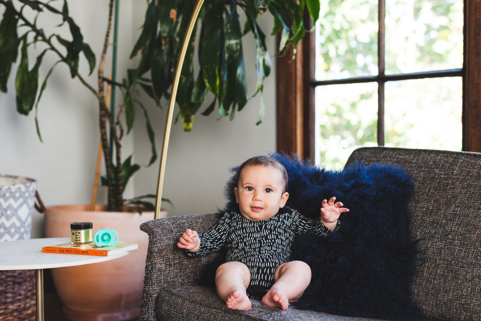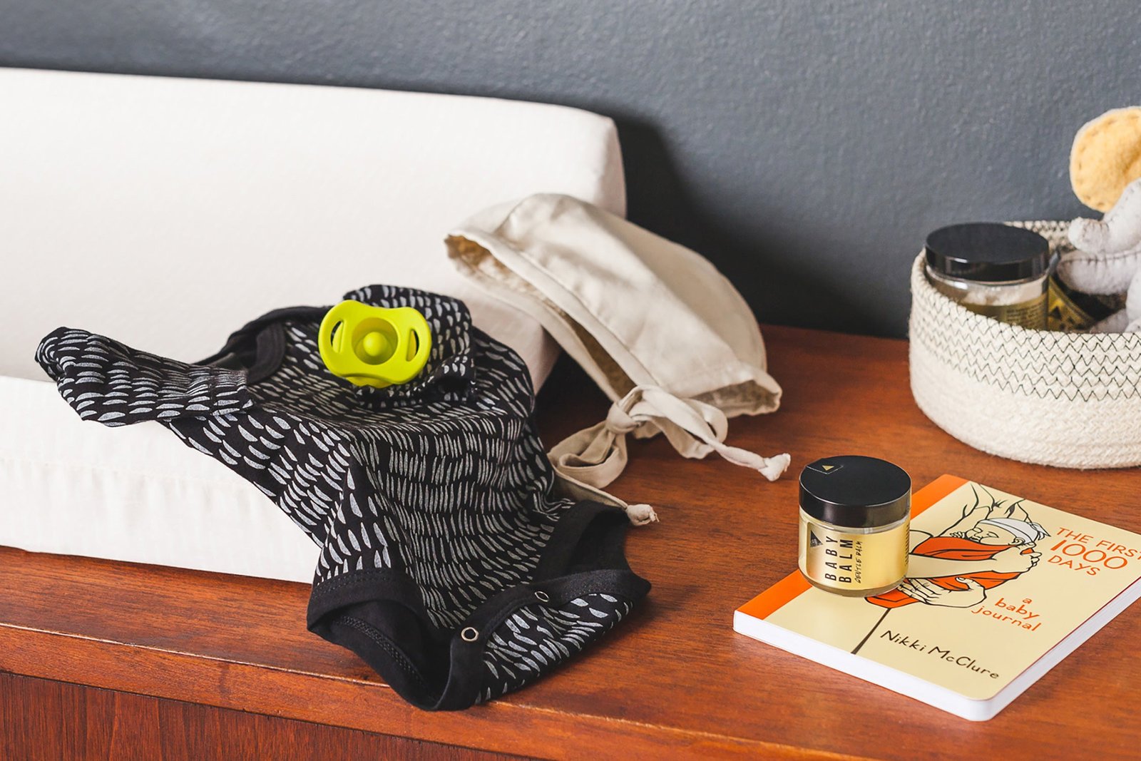 Welcome the newest little arrival with this luxe gift box of goodies including a cool onesie. an eco pacifier. an organic linen teether. soothing baby balm. and a Nikki McClure baby journal.