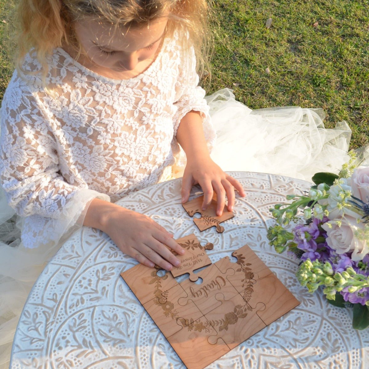 We all know that your big day is also your flower girl’s big day too. so make it extra special by asking her with a wooden flower girl puzzle piece.